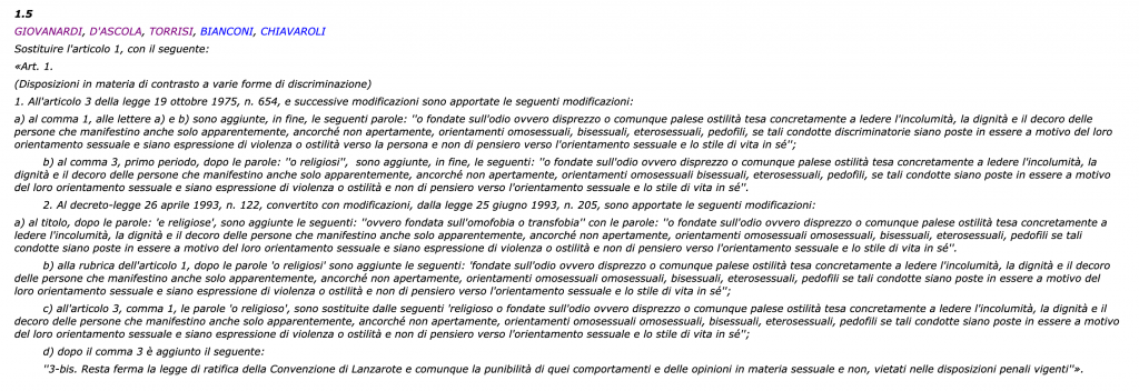 Abbiamo infatti, scorrendo l’articolo, casi in cui si chiedono contemporamente, con successivi emendamenti, aggiunte a singoli commi seguite dalla richiesta di abrogazione in toto di comma arricchito di definizioni sempre più dettagliate, e se la pedofilia compare solo in uno degli emendamenti a firma Giovanardi come probabile momento di riflessione e provocazione, in successivi emendamenti compaiono estensioni a concetti come la pedofobia e la cristianofobia, emendamenti che prevedono ogni possibile gradazione della sanzione irrogata da 6000 a 500 euro ed altre richieste di emendamento che portano al numero ingente di emendamenti che leggerete in quella pagina.
