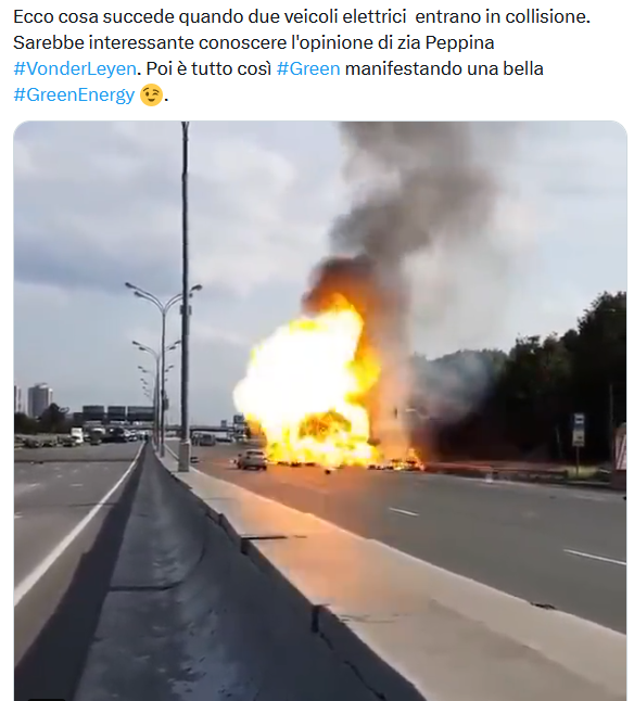 Il video con due veicoli elettrici in collisione ci viene presentato con una didascalia che condanna sia l’ambientalismo che Ursula Von Der Leyen, secondo una narrativa (spesso politicamente strumentale) che vede nell’ambientalismo e nei vaccini un “grimaldello” per diffondere narrazioni che indeboliscono l’Europa.