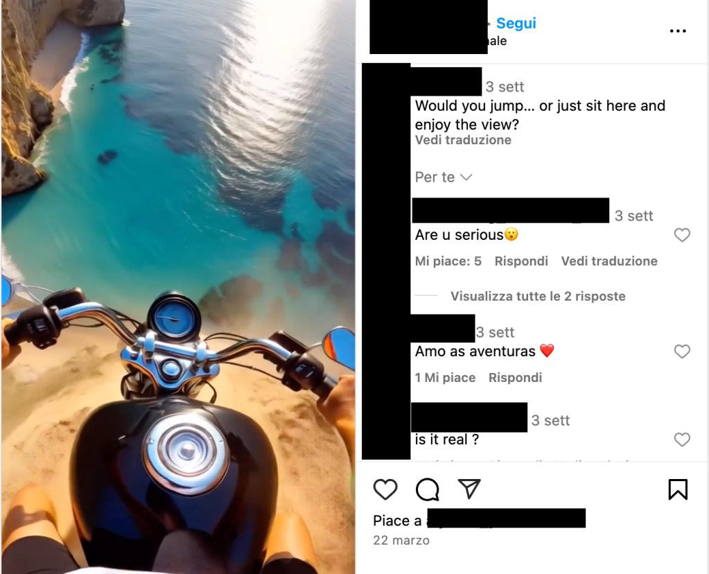 Ci segnalano un video dell’audace motociclista sulla spiaggia pubblicato su Instagram, uno spezzone in un cui un motociclista si lancia da uno scosceso pendio vedendo scenari da sogno, con commentatori a meravigliarsi dell’azione, chiedendosi se ciò che vedono sia vero.