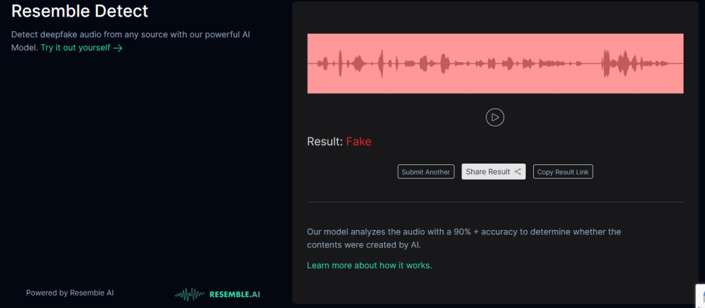 Ascoltando con attenzione l’audio si potranno percepire toni e pause innaturali, del resto le AI non hanno bisogno di respirare per parlare. Elemento questo certificato dal programma di analisi dell’audio “Resemble Detect” (archiviato qui).