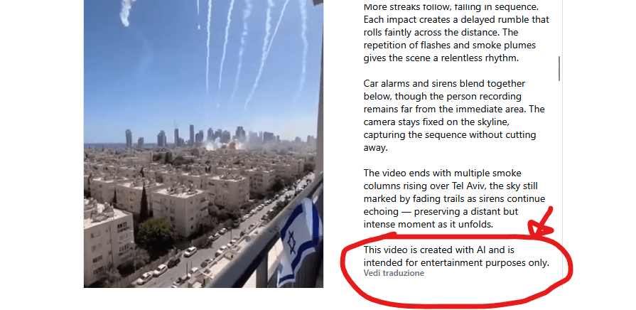 Il video, generato con AI, fa parte di quel becero feticismo dell’orrore che abbiamo visto in più esemplari (qui, qui, qui e qui ad esempio) che porta utenti senza scrupoli ad usare l’intelligenza artificiale per creare scene di guerra e violenza “più vere del vero”, più violente scioccanti e brutali dell’orrore già in atto in Medio Oriente allo scopo di eccitare sentimenti di caccia al click.