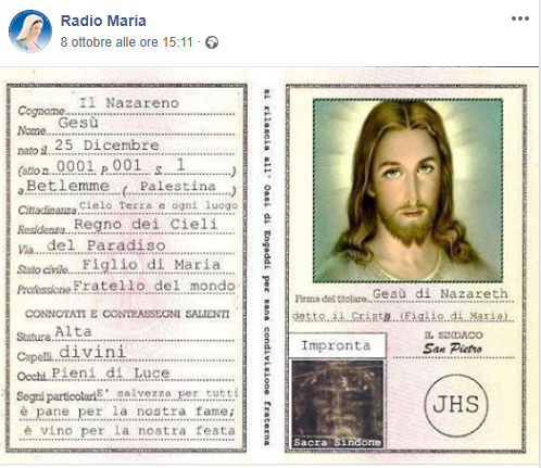 In ogni caso, la notizia è vera: Radio Maria ha pubblicato una pseudo carta d’identità di Gesù Cristo e il post è ancora online.