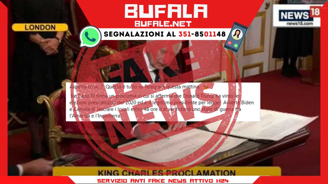 Il post mostra Re Carlo III intento a firmare un documento mentre la didascalia afferma che Donald Trump è il legittimo presidente e quindi il Sovrano del Regno Unito si appresterà a sfrattare Joe Biden e Kamala Harris come l’ultimo degli ufficiali giudiziari, intimandogli di “lasciare i locali” oppure dichiarerà guerra agli USA.