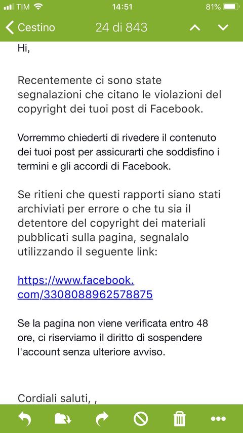Un invito a cliccare su un link perché “ci sono state segnalazioni che citano le violazioni di copyright di Facebook”.
