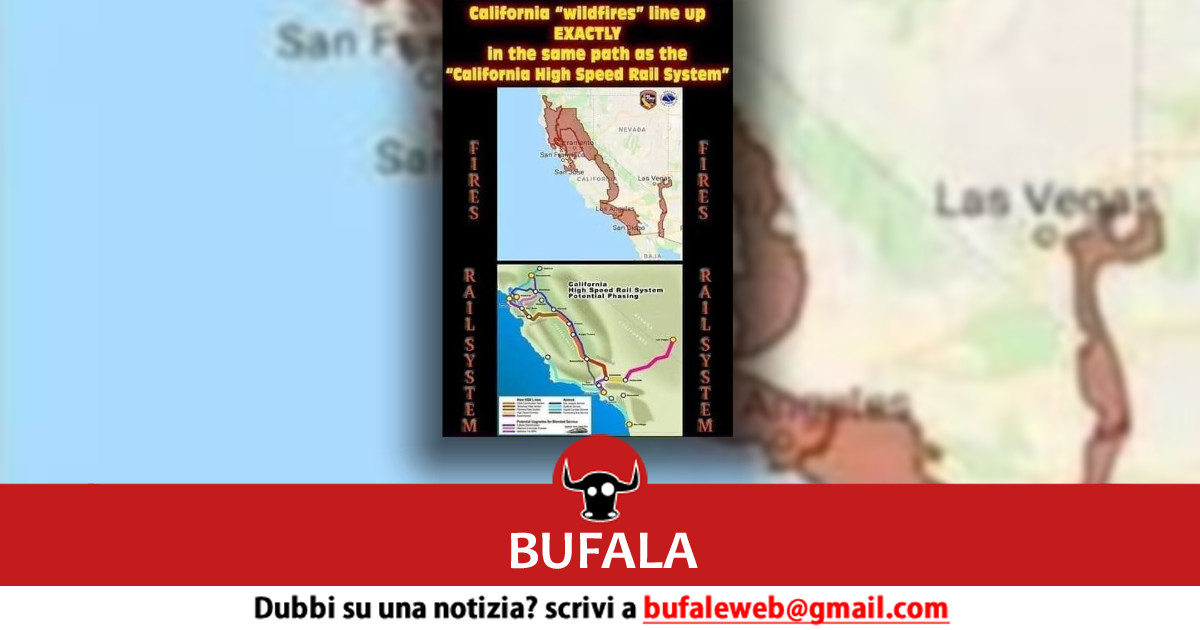 Certamente, posizionando due immagini a bassissima risoluzione vicine l’una all’altra e sperando che i tuoi lettori non siano attenti, si potrebbe convincere alcuni che il profilo rosso corrispondente all’estensione degli incendi poteva sembrare simile alla mappa proposta della California per la ferrovia ad alta velocità. Ci sono, naturalmente, diversi problemi con il confronto presentato.