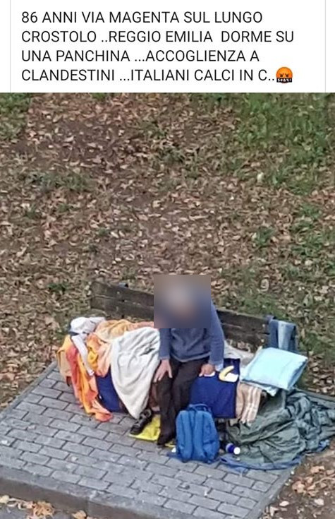 “Reggio Emilia, via Magenta sul Lungo Crostolo. A 86 anni dorme su una panchina e noi accogliamo i clandestini”