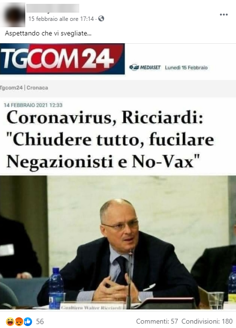 “Aspettando che vi svegliate”, scrive l’autrice del post. Secondo l’immagine postata Walter Ricciardi, consigliere del Ministero della Salute, avrebbe proposto di “chiudere tutto” e “fucilare negazionisti e no-vax”. Sarebbe divertente, se tutto fosse proposto come un lancio di black humor. Il post si presenta come uno screenshot da TgCom24 palesemente fake, ma anziché suscitare ilarità scatena i commenti dei complottisti che rispondono con una certa violenza. L’autrice del post, in effetti, a giudicare dal suo profilo è una convinta negazionista e no-vax, per questo il suo post ottiene un certo seguito.