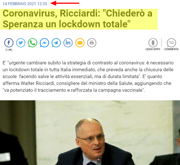 Titolo: “Coronavirus, Ricciardi: ‘Chiederò a Speranza un lockdown totale'”. Testo: