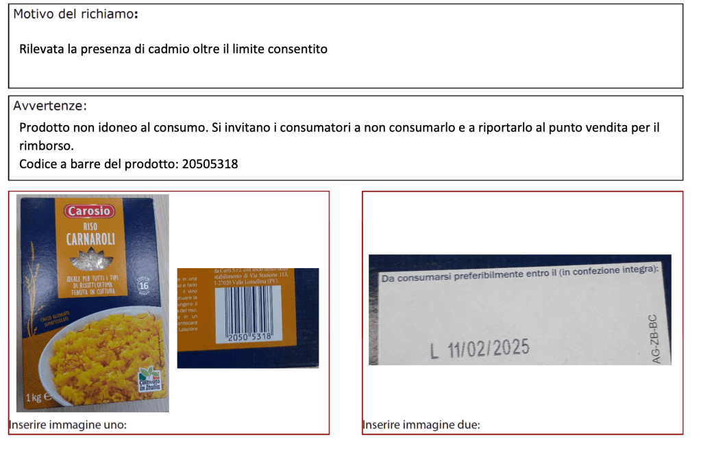 C’è un richiamo alimentare in corso per il riso carnaroli Carosio, come correttamente riportato sul portale del Ministero della Salute alla voce legata ai richiami richiesti dagli stessi operatori