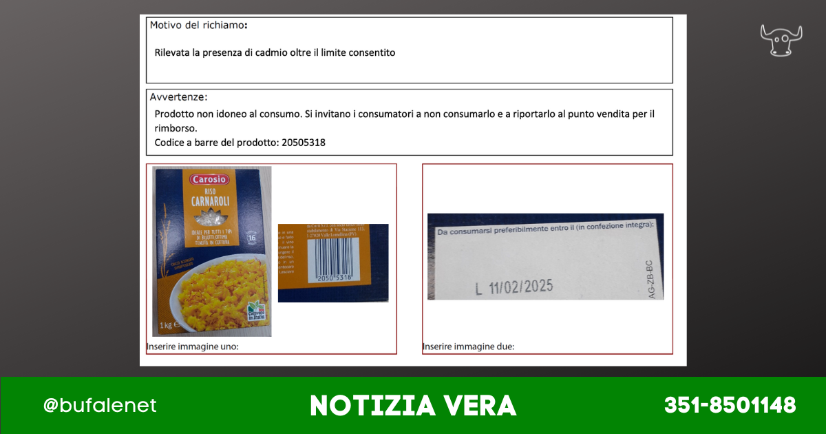 Il ritiro riguarda un lotto in particolare, il riso carnarolo Carosio, codice a barre 20505318,prodotto dall’azienda Curti Srl, nello stabilimento di viale Stazione 113, a Valle Lomellina, scadenza 11/02/2025.