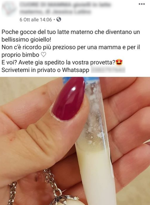 I nostri lettori ci hanno segnalato un caso avvenuto sulla pagina Facebook degli amici di Abolizione del Suffragio Universale. Ieri, 30 ottobre, gli autori hanno pubblicato un post in cui veniva mostrato un annuncio messo in rete da una pagina Facebook in cui veniva messo in vendita un gioiello fatto con il latte materno. Il nome della pagina e il post riportavano le generalità dell’autrice e il numero che questa proponeva per essere contattata su WhatsApp.