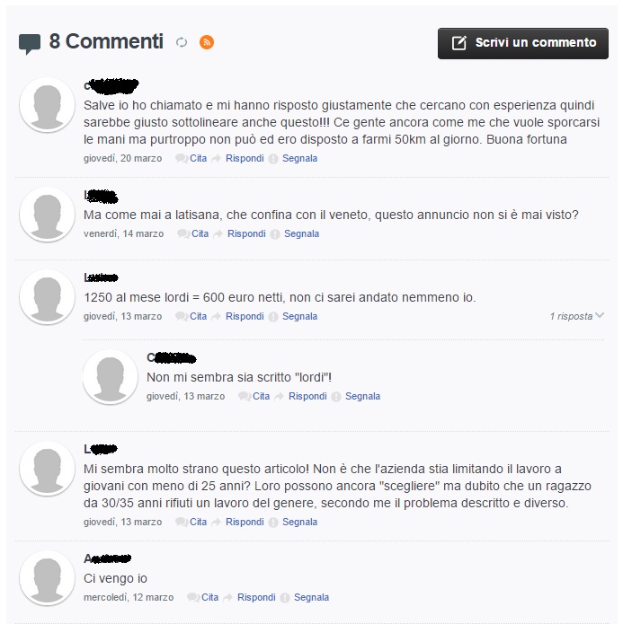 La notizia, ove il commento del 20 marzo fosse confermato, acquisirebbe un sapore diverso: infatti non saremmo più di fronte ad un popolo di Italiani “viziati”, incapaci di apprezzare il duro lavoro, ma dinanzi alla difficoltà di trovare, in una economia dove forte è la disoccupazione giovanile e chi ha in passato avuto l’opportunità di trovare lavoro ora cerca di difendere tale dono con le unghie e coi denti, un “lavoratore con esperienza” in grado di mettersi immediatamente all’opera.
