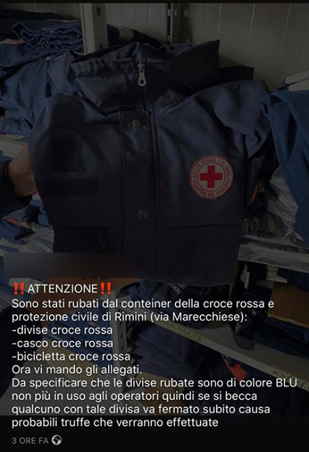 Sono stati rubati dal container della Croce Rossa e Protezione Civile di Rimini (via Marecchiese): divise Croce Rossa, casco Croce Rossa, bicicletta Croce Rossa. Ora vi mando gli allegati. Da specificare che le divise rubate sono di colore BLU non più in uso agli operatori quindi se si becca qualcuno con tale divisa va fermato subito causa probabili truffe che verranno effettuate.