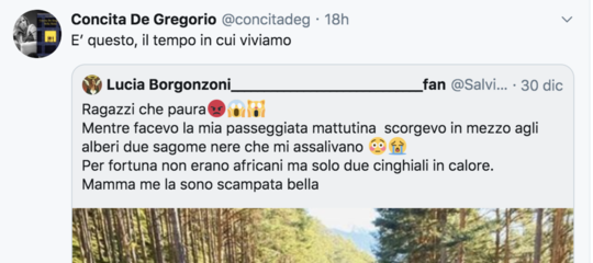 Ragazzi che paura. Mentre facevo la mia passeggiata mattutina scorgevo in mezzo agli alberi due sagome nere che mi assalivano. Per fortuna non erano africani ma solo due cinghiali in calore. Mamma me la sono scampata bella.