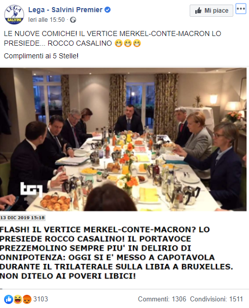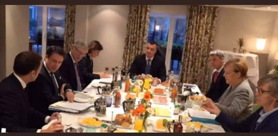 Un’immagine in circolazione su Facebook mostra l’ex GF Rocco Casalino, oggi consulente politico, seduto a capotavola durante un incontro tra il premier italiano Giuseppe Conte, la cancelliera tedesca Angela Merkel e il leader francese Emmanuel Macron.