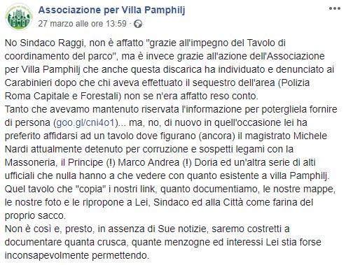 Tra i commenti alcuni utenti fanno notare che i meriti sarebbero da attribuire all’Associazione per Villa Pamphilj, organizzazione no-profit che si occupa della tutela del patrimonio del parco di Villa Doria Pamphilj. Dalla pagina Facebook dell’associazione, infatti, alcune ore dopo il comunicato pubblicato da Virginia Raggi, è comparso un post di risposta dove vengono rivendicate le iniziative di bonifica dall’amianto del sito, che il sindaco di Roma attribuisce “anche” al Tavolo di coordinamento del parco.