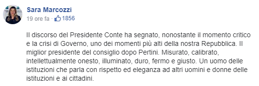 Sara Marcozzi su Facebook: “Conte il miglior Presidente del Consiglio dopo Pertini”
