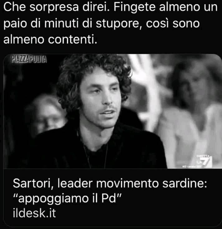 Un meme in libera circolazione mette di nuovo al centro dell’attenzione Mattia Sartori, leader del noto movimento delle sardine che nelle ultime settimane è diventato un nuovo topic del dibattito politico e social. Il meme fa riferimento al sito IlDesk.it, che in un articolo pubblicato il 24 novembre ha infatti attribuito all’attivista il virgolettato riportato nel meme: “Appoggiamo il PD”.