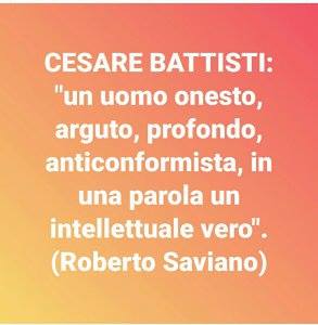Secondo il meme, Saviano avrebbe descritto Cesare Battisti come “Un uomo onesto, arguto, profondo, anticonformista, in una parola un intellettuale vero”, ma queste parole non appartengono allo scrittore. Per rispondere alle richieste di chiarimento vi rimandiamo nuovamente all’appello di Carmilla Online del 2004: