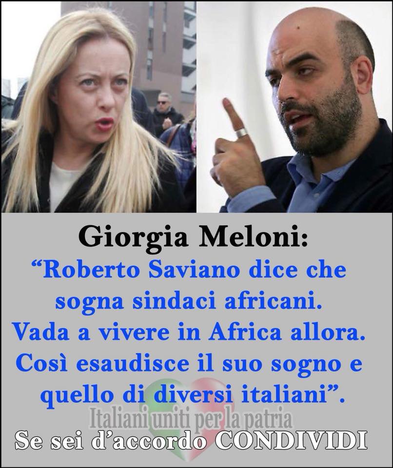 Giorgia Meloni: “Roberto Saviano dice che sogna sindaci africani. Vada a vivere in Africa allora. Così esaudisce il suo sogno e quello di diversi italiani”.