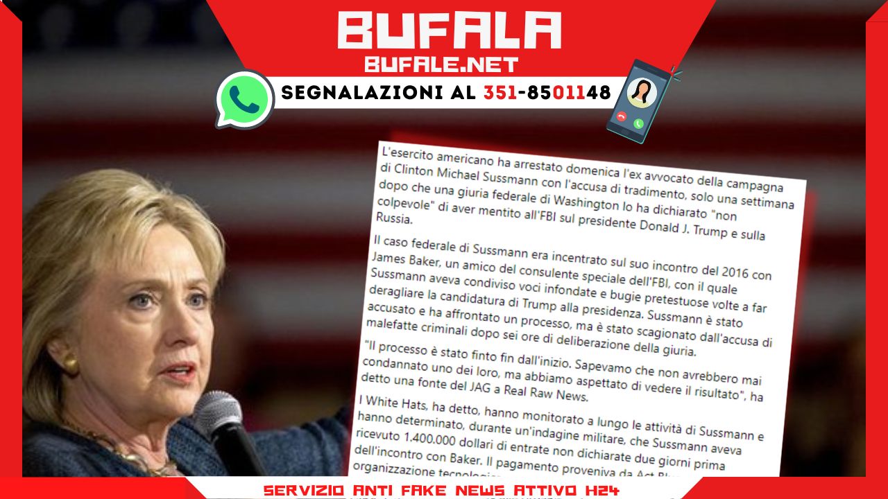 Secondo un post pubblicato su Facebook Michael Sussmann, ex avvocato della campagna presidenziale di Hillary Clinton, sarebbe stato arrestato per alto tradimento. Chi pubblica questa fa riferimento a Real Raw News e riporta che Sussmann è stato catturato dall’esercito americano. Perché si parla di tradimento? Nel 2016 l’ex avvocato avrebbe incontrato James Baker, un gancio dell’FBI, avrebbe condiviso notizie fuorvianti su Trump per disorientare gli elettori.