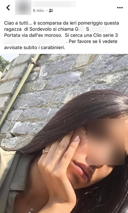 Ciao a tutti… è scomparsa da ieri pomeriggio questa ragazza di Sordevolo si chiama G.S.. Portata via dall’ex moroso. Si cerca una Clio serie 3 con ***numero di targa***. Per favore se li vedete avvisate subito i carabinieri.