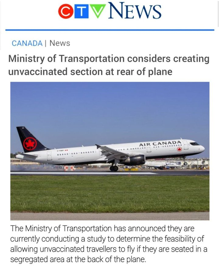 Il Ministero dei Trasporti canadese avrebbe deciso di istituire uno scompartimento riservato ai non vaccinati sugli aerei. La notizia arriverebbe da CTV News ed è stata condivisa sui social tramite uno screenshot. Questo contenuto sta scatenando una forte indignazione tra i no-vax, che come in tante altre occasioni lamentano una discriminazione ai loro danni.
