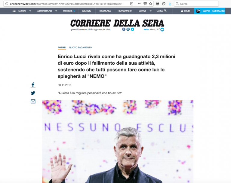 È il caso di Enrico Lucci, colpito da una bufala gli attribuiva la vincita di 2,3 milioni di euro grazie ai bitcoin. La falsa notizia era comparsa su una falsa pagina web che copiava il template del Corriere della sera, e abbiamo scritto qui la nostra smentita.