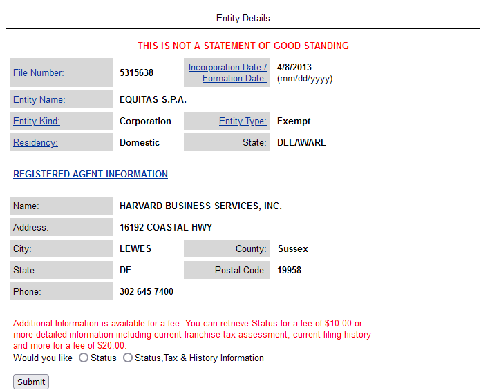 Reperibile su un elenco gestito dallo Stato del Delaware con la nota che non si tratta di una anagrafe di aziende “in regola”, solo di certificazioni richieste.