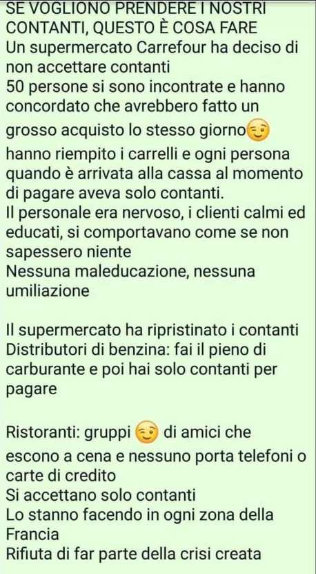 La condivisione virale su WhatsApp e Telegram riporta una storia secondo cui un supermercato avrebbe rifiutato di accettare pagamenti in contanti e un gruppo di cittadini informati si sarebbero incontrati per “fare un grosso acquisto” e pagare in contanti in un flashmob improvvisato che avrebbe sconfitto la multinazionale.