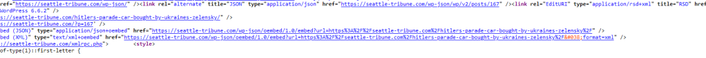 Ma non dilunghiamoci oltre e passiamo al contenuto. Il contenuto è una bizzarra storiella, in parte composta con l’AI che descrive la malvagità di Hitler e la sua “fissazione” per le automobili, concludendo coi “giornalisti americani”, abbiamo visto immaginari che giurano di aver visto Zelensky aggirarsi sulla macchina di Hitler in un “quartiere di Seattle noto per essere casa di Bill Gates e Jeff Bezos”