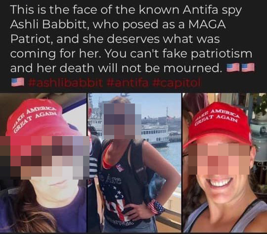 “Questa è la faccia della nota spia Antifa Ahsli Babbit, che ha fatto finta di essere una Patriota MAGA e si è meritata quello che le è successo. Non puoi fingere di essere una Patriota, non piangeremo per la tua morte”.