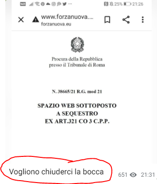 Per questo nel decreto si legge che “Gli indagati svolgono mediante l’utilizzo del web un’attività di condivisione e giustificazione e dunque di esaltazione e incitamento alla commissione di reati connotati da violenza“. Dal canale Telegram di Forza Nuova, intanto, alle 21:31 è arrivato il primo commento: “Vogliono chiuderci la bocca”.