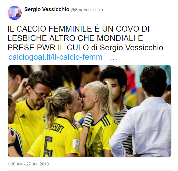 Tutto vero, quindi: Sergio Vessicchio scrive che il calcio femminile è un covo di lesbiche, e anche se usa a più riprese (e anche un po’ a caso) l’avverbio di modo “rispettabilmente”, emerge un certo disprezzo.