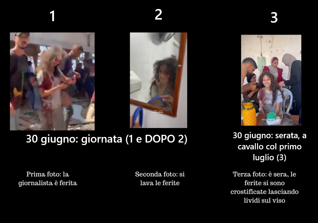Abbiamo video dove la giornalista si aggira insanguinata tra le macerie, un video dove essa si pulisce il viso, e un video finale dove essa ha ecchimosi e croste sul viso, compatibili col decorso di una ferita.