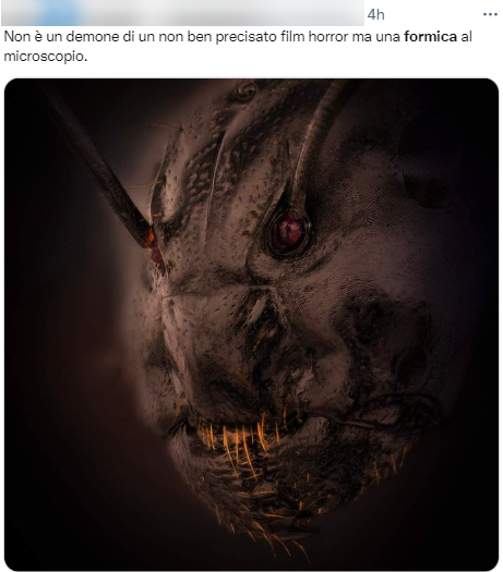 “Non è un demone di un non precisato film horror ma una formica al microscopio”. L’utente dice il vero. Con una ricerca inversa per immagini scopriamo che lo scatto è firmato dal fotografo Eugenijus Kavaliauskas, e in questa scheda scopriamo che quest’anno la foto ha partecipato al contesto della 2022 Photomicrography Competition.