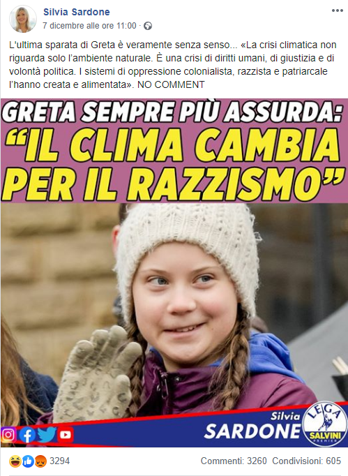 Un post pubblicato da Silvia Sardone su Facebook il 7 dicembre mostra una citazione attribuita all’attivista di Fridays For Future Greta Thunberg. Si tratta di una semplificazione di un discorso più ampio, ripresa con la stessa strategia da Il Giornale in un articolo pubblicato il 4 dicembre.
