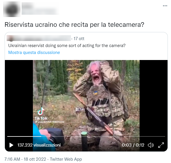 “Riservista ucraino che recita per la telecamera”, questo recita la didascalia di un video pubblicato su Twitter in cui vediamo un uomo in abiti militari picchiarsi sulla testa con fare disperato. Di fronte a lui possiamo vedere un operatore.
