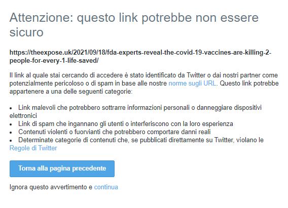 Sappiamo quindi che alcuni contenuti sono stati identificati come vietati dalle norme sugli URL di Twitter, e che l’account di Malone risulta sospeso permanentemente.