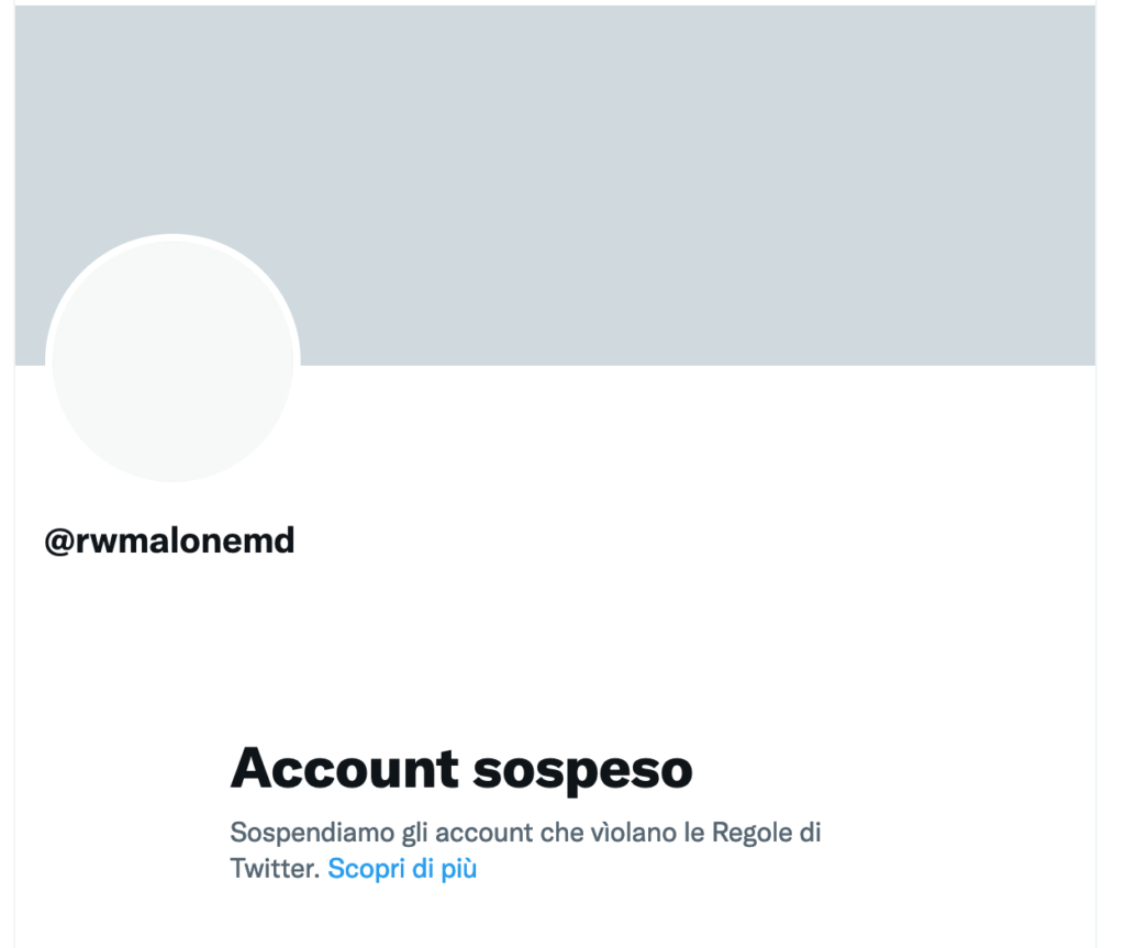 Cosa che non potrà più accadere, dal momento che risulta da ieri sospeso l’account Twitter di Robert Malone, ovviamente.