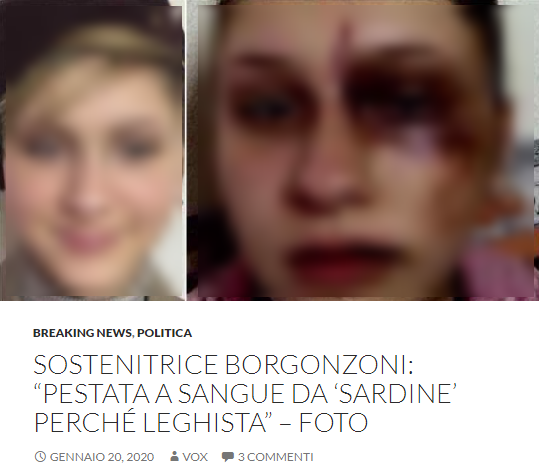 Sono piovute in queste ore le segnalazioni della presunta sostenitrice della candidata Lucia Borgonzoni candidata con la Lega per le regionali dell’Emilia Romagna. Secondo il suo racconto, pubblicato da VoxNews oggi 20 gennaio 2020, un gruppo di 6 persone l’avrebbe aggredita mentre si trovava all’esterno dell’Esselunga di via Milano, a Brescia, insieme ad alcuni suoi amici della Lega Giovani. A colpire il popolo social, oltre al suo racconto, sono le foto pubblicate da lei stessa che mostrerebbero il suo volto ferito.