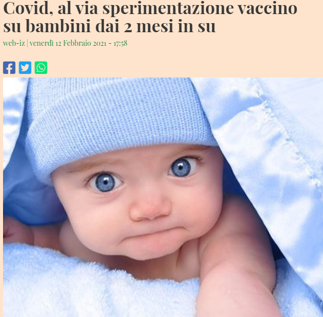 I nostri lettori ci segnalano un articolo pubblicato il 12 febbraio 2021 su Quotidiano di Sicilia dal titolo: “Covid, al via sperimentazione vaccino su bambini dai 2 mesi in su“. La notizia è vera ma richiede delle precisazioni. Innanzitutto la sperimentazione non è ancora iniziata e la novità non interessa l’intero territorio nazionale. Si tratta del vaccino Johnson & Johnson che verrà sperimentato sui bambini dai due mesi in su fino agli adolescenti di 18 anni in vari centri internazionali. In Italia è stato scelto l’ospedale Buzzi di Milano.