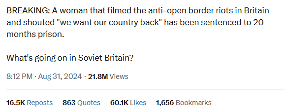 La bufala diffusa, tra gli altri, dallo stesso Elon Musk fa parte del filone del doppio binario, la teoria diffusa dagli stessi canali Telegram e di estrema destra che hanno diffuso la fake news che ha originato le violenze (la bufala “dell’immigrato assassino sceso dai barconi”) per cui le autorità inglesi avrebbero il pugno di ferro con gli “innocui manifestanti”, spesso persone arrestate per atti violenti di vario tipo, ed invece sarebbero assai clementi verso gli immigrati, teorie false e usate per creare falsa narrazione.