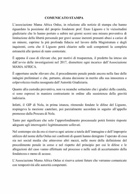 L’associazione Mama Africa Onlus, in relazione alle notizie di stampa che hanno riguardato la posizione del proprio fondatore Prof. E.L. e le vicissitudini giudiziarie che lo hanno portato a subire nei giorni scorsi una misura preventiva di limitazione della libertà personale per gravi accuse inerenti presunti abusi a carico di un minore, esprime la più profonda fiducia nel lavoro della Magistratura e degli inquirenti, certa che il L. potrà chiarire nelle sedi competenti la completa estranietà alle ipotesi di reato contestate.