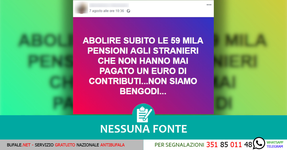 Un post pubblicato da un utente Facebook il 7 agosto ha superato le 20mila condivisioni pur trattandosi di un’affermazione che riporta dati privi di fondamento. Abolire subito le 59mila pensioni agli stranieri che non hanno mai pagato un euro di contributi… non siamo bengodi… I commentatori richiedono a gran voce la fonte di questo dato, […]