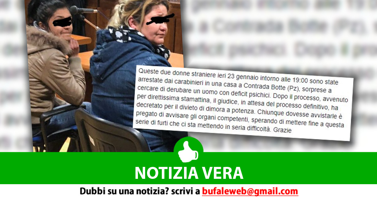 Ci segnalano un’immagine in circolazione su Facebook nelle ultime ore: Queste due donne straniere ieri 23 gennaio intorno alle 19:00 sono state arrestate dai carabinieri in una casa a Contrada Botte (Pz), sorprese a cercare di derubare un uomo con deficit psichici. Dopo il processo, avvenuto per direttissima stamattina, il giudice, in attesa del processo […]