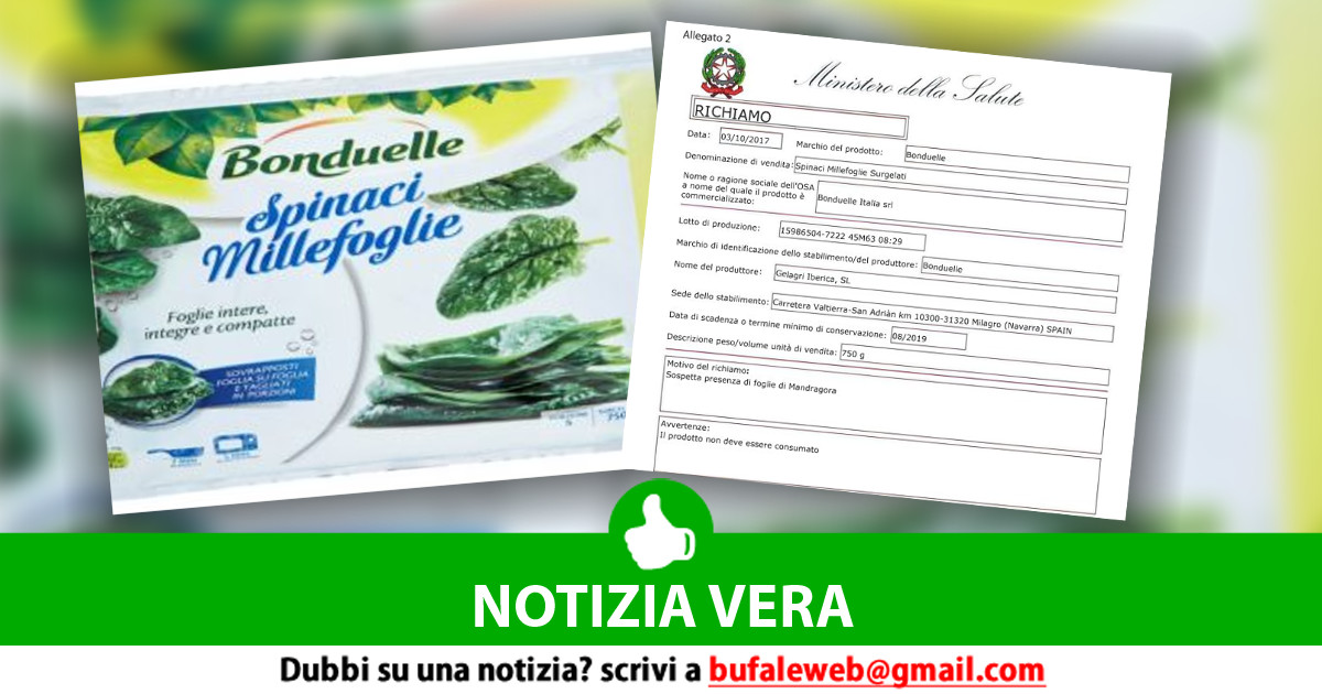 Fanpage riporta il ritiro di un lotto di spinaci della Bonduelle: Il ministero della Salute ha comunicato il ritiro degli Spinaci Millefoglie surgelati 750 grammi Bonduelle per la probabile presenza di mandragora una pianta che ha proprietà narcotiche ed è altamente tossica. Nel comunicato è espressamente indicato che “il prodotto non deve essere consumato”. Un ritiro analogo si era già avuto all’inizio del mese […]