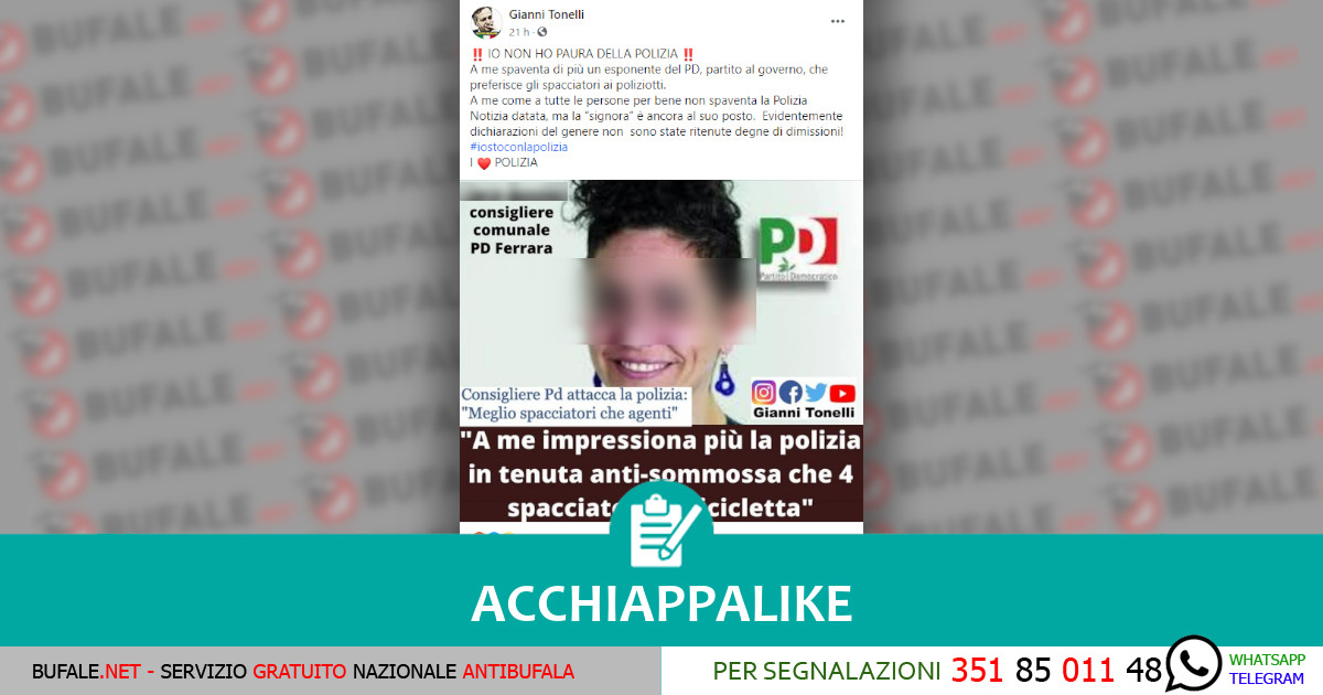 “Meglio spacciatori che agenti”, leggiamo in un post pubblicato dal deputato Lega Gianni Tonelli nella giornata di ieri, 31 agosto 2020, di cui i nostri lettori ci chiedono verifica. Nel post vediamo il volto di una consigliera comunale PD di Ferrara accompagnato da una citazione a lei attribuita. Secondo la narrazione di Tonelli la consigliera preferirebbe […]