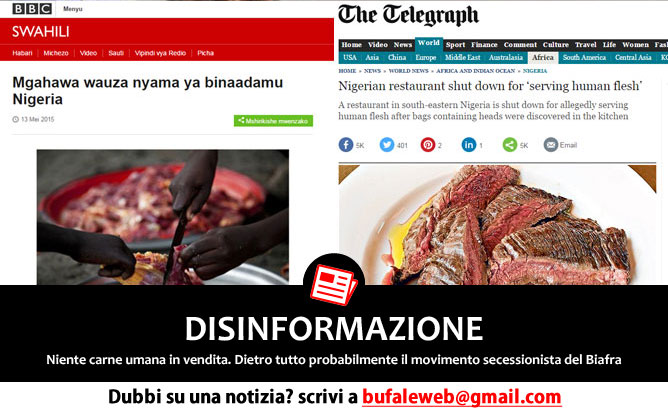 Torna a parlare di se la storia, falsa, del ristorante nigeriano che vendeva carne umana. A diffonderla nuovamente è stata la sezione Swahili del sito BBC nell’articolo del 13 maggio 2015 dal titolo “Mgahawa wauza nyama ya binaadamu Nigeria“. La stessa notizia è stata poi ripresa da Telegraph.co.uk, il 17 maggio 2015, con l’articolo dal titolo “Nigerian restaurant shut […]