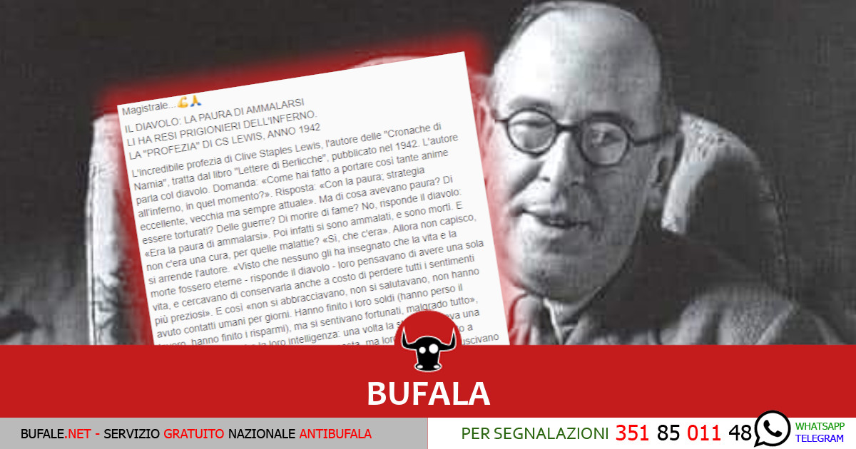 Il nuovo tormentone dei complottisti è una profezia di CS Lewis, scritto per esteso Clive Staples Lewis, noto autore de Le Cronache di Narnia e attuale idolo dei mendicanti del web. In un post virale viene citato un passaggio attribuito all’opera Le Lettere di Berlicche, pubblicato dall’autore nel 1942 dopo una prima apparizione sul quotidiano The Guardian. Il […]